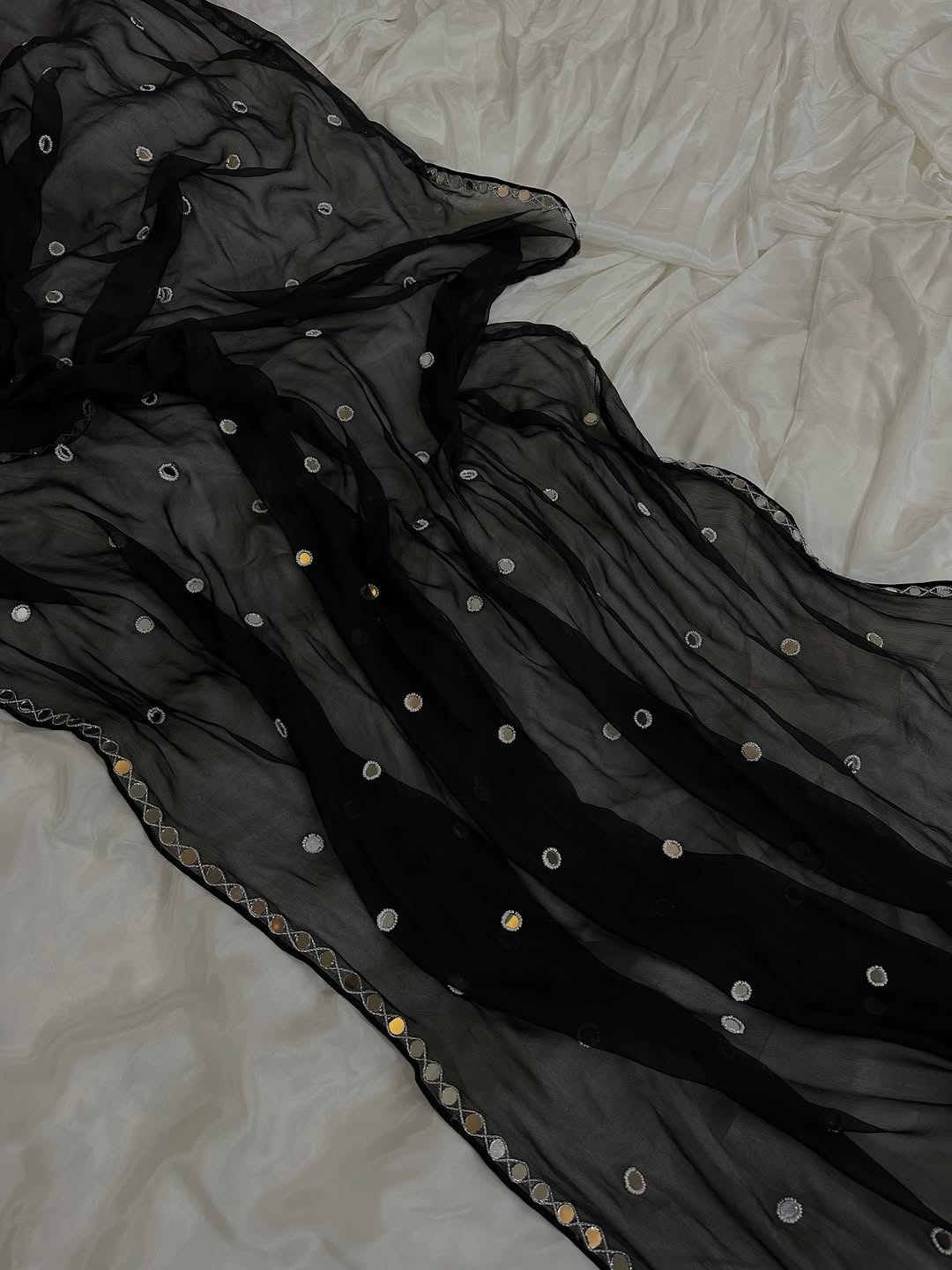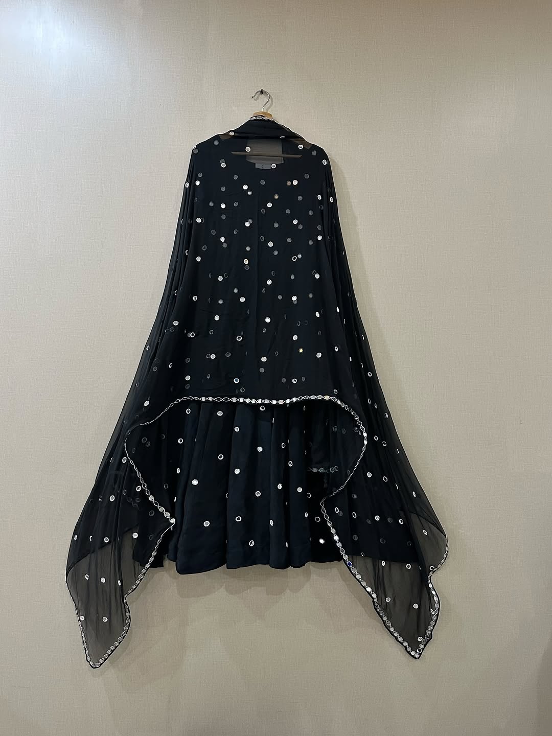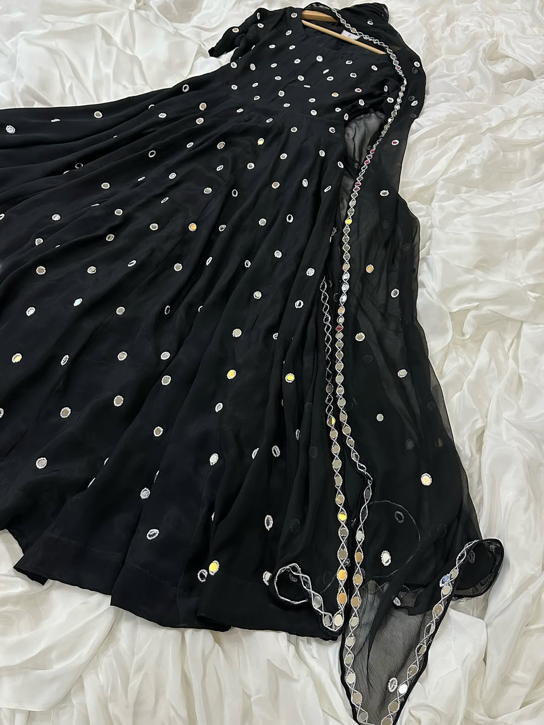 A stunning Black Noor intricately hand-embellished with mirror and bead work, paired with a chiffon dupatta adorned with mirror details, beadwork, and mirror lace, completed with a classic churidar.