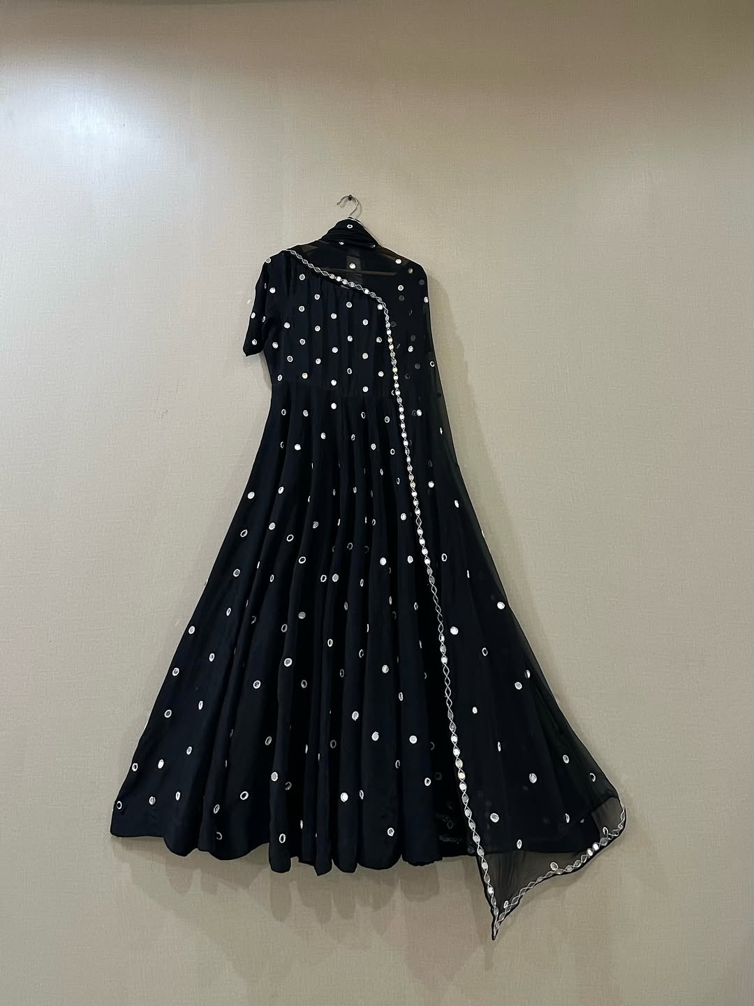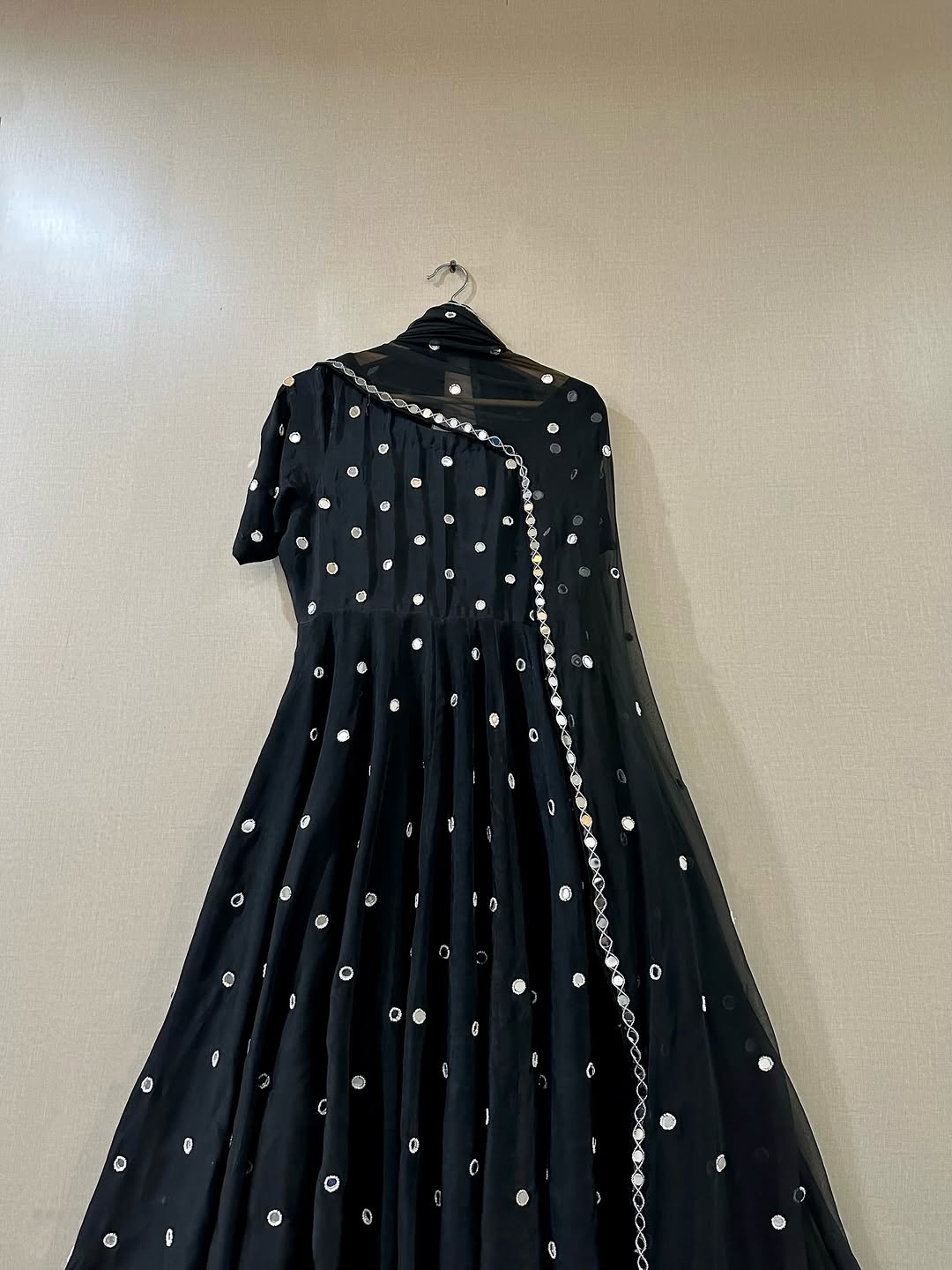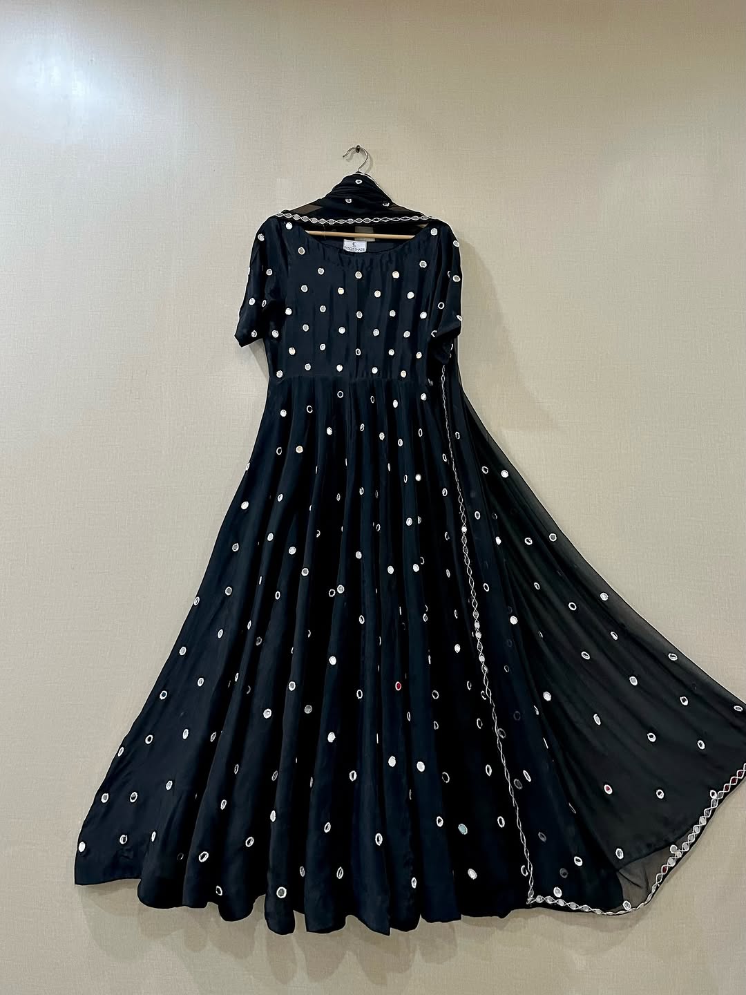 A stunning Black Noor intricately hand-embellished with mirror and bead work, paired with a chiffon dupatta adorned with mirror details, beadwork, and mirror lace, completed with a classic churidar.