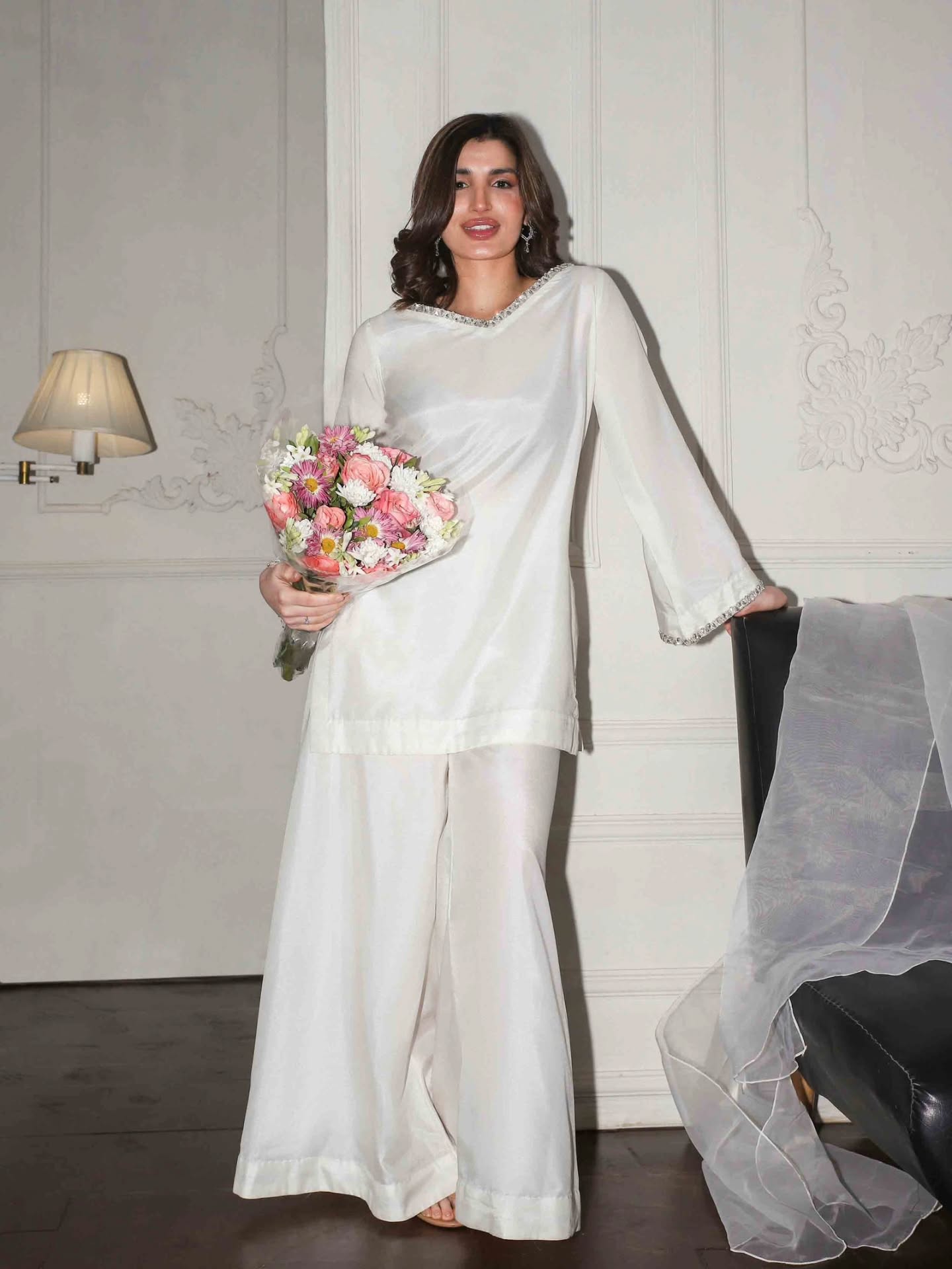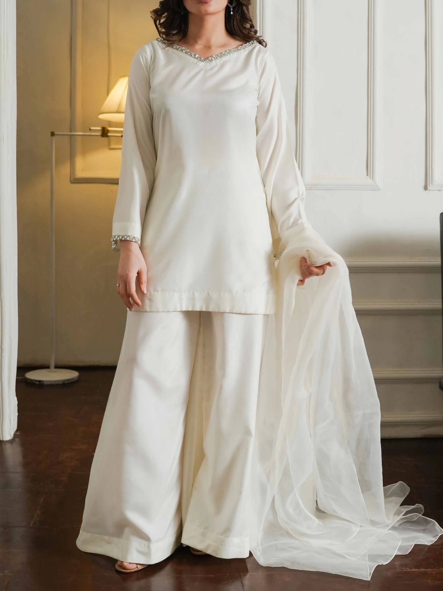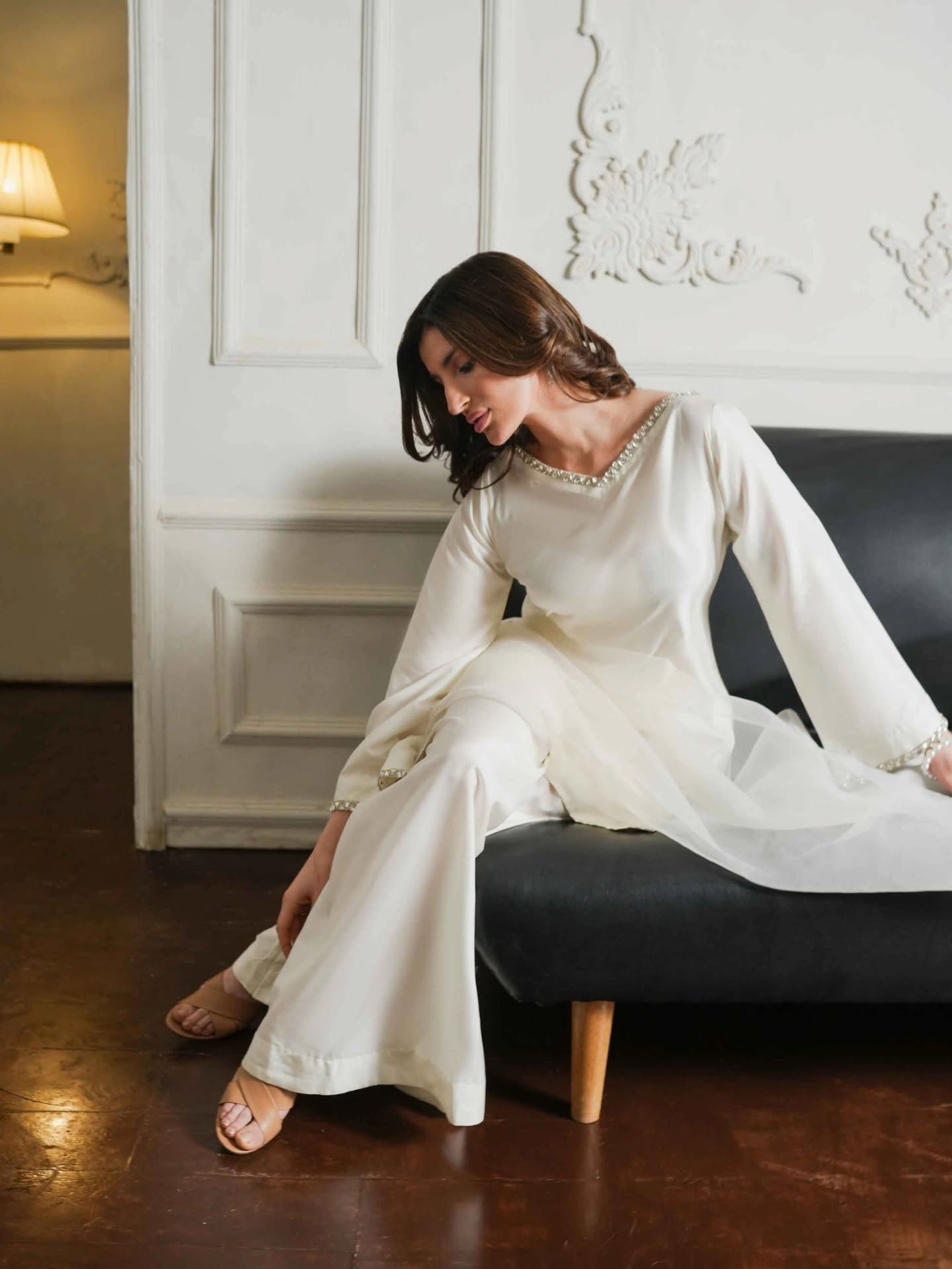 An elegant ensemble featuring a luxe silk shirt with a delicate pearl-embellished neckline and statement flared sleeves. Paired with matching wide-leg trousers and a sheer organza dupatta, this look blends minimalist grace with timeless sophistication.