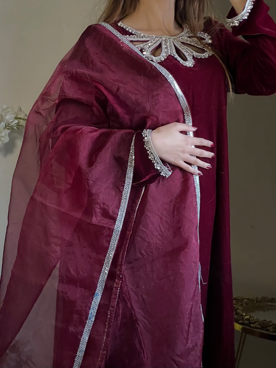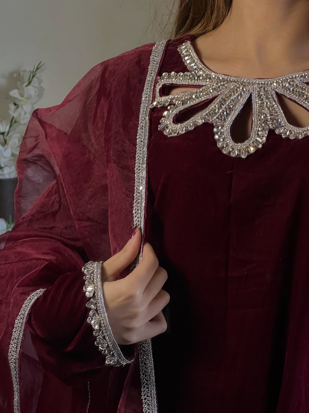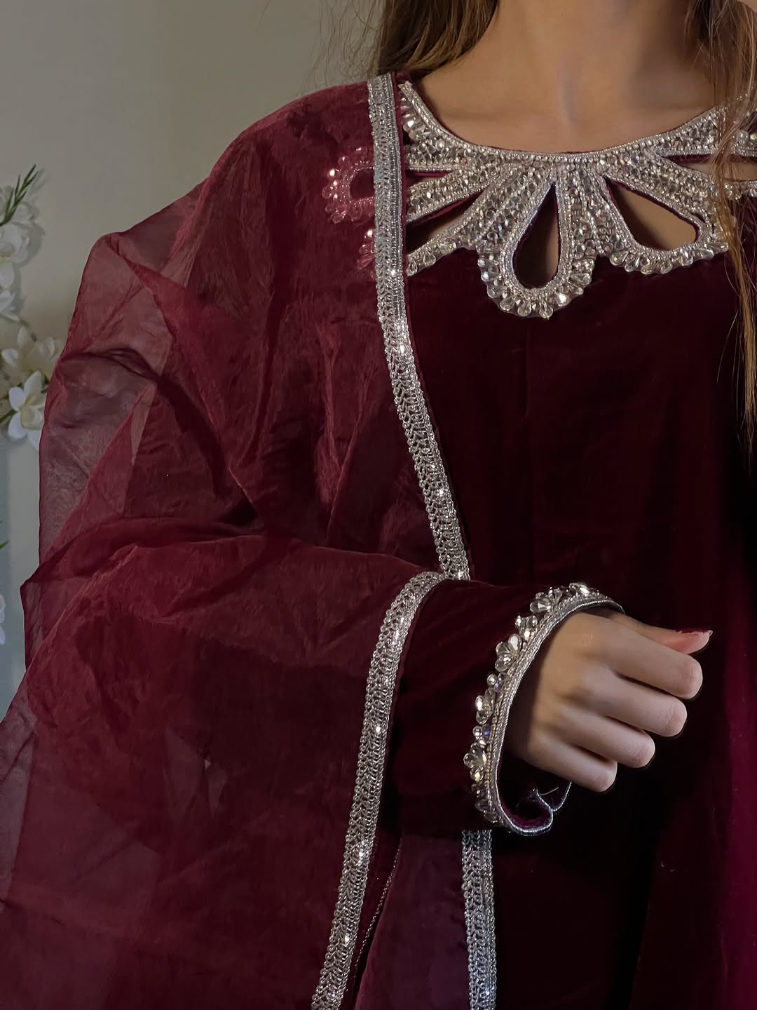 This mahroon dress is Crafted from luxurious Micro Velvet 9000, detailed with crystal-studded neck & sleeves, paired with an organza dupatta finished with 4-side lace. Perfectly made for wedding season, Because winter deserves a touch of royalty. ❄️