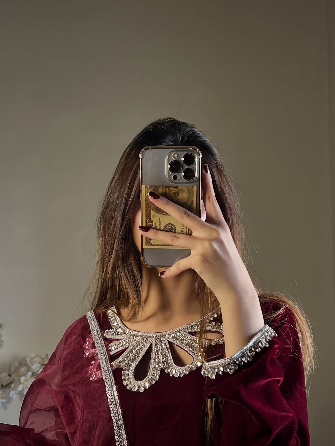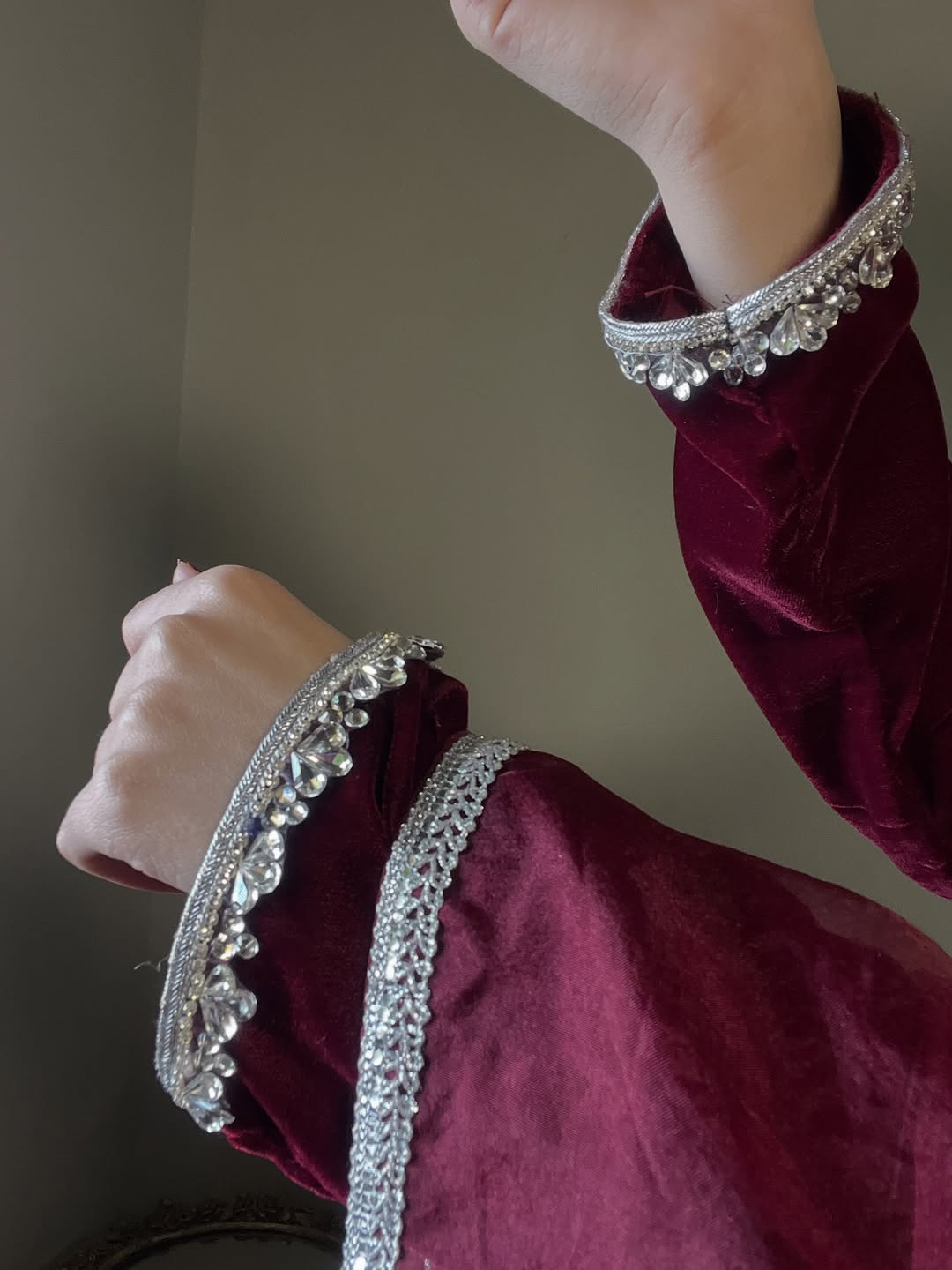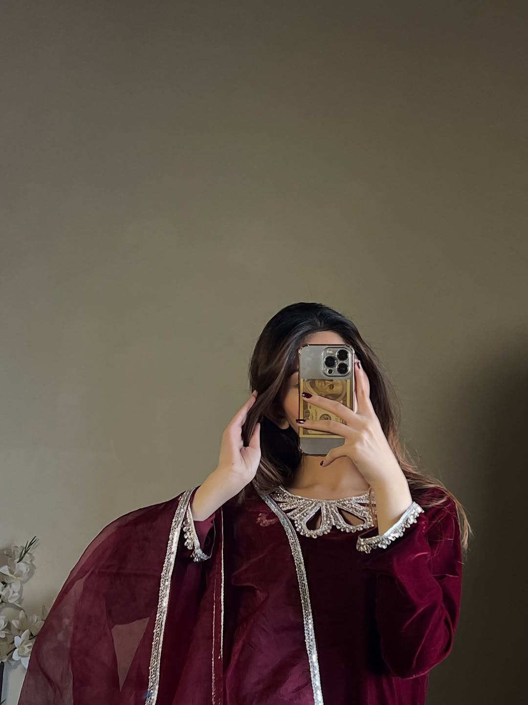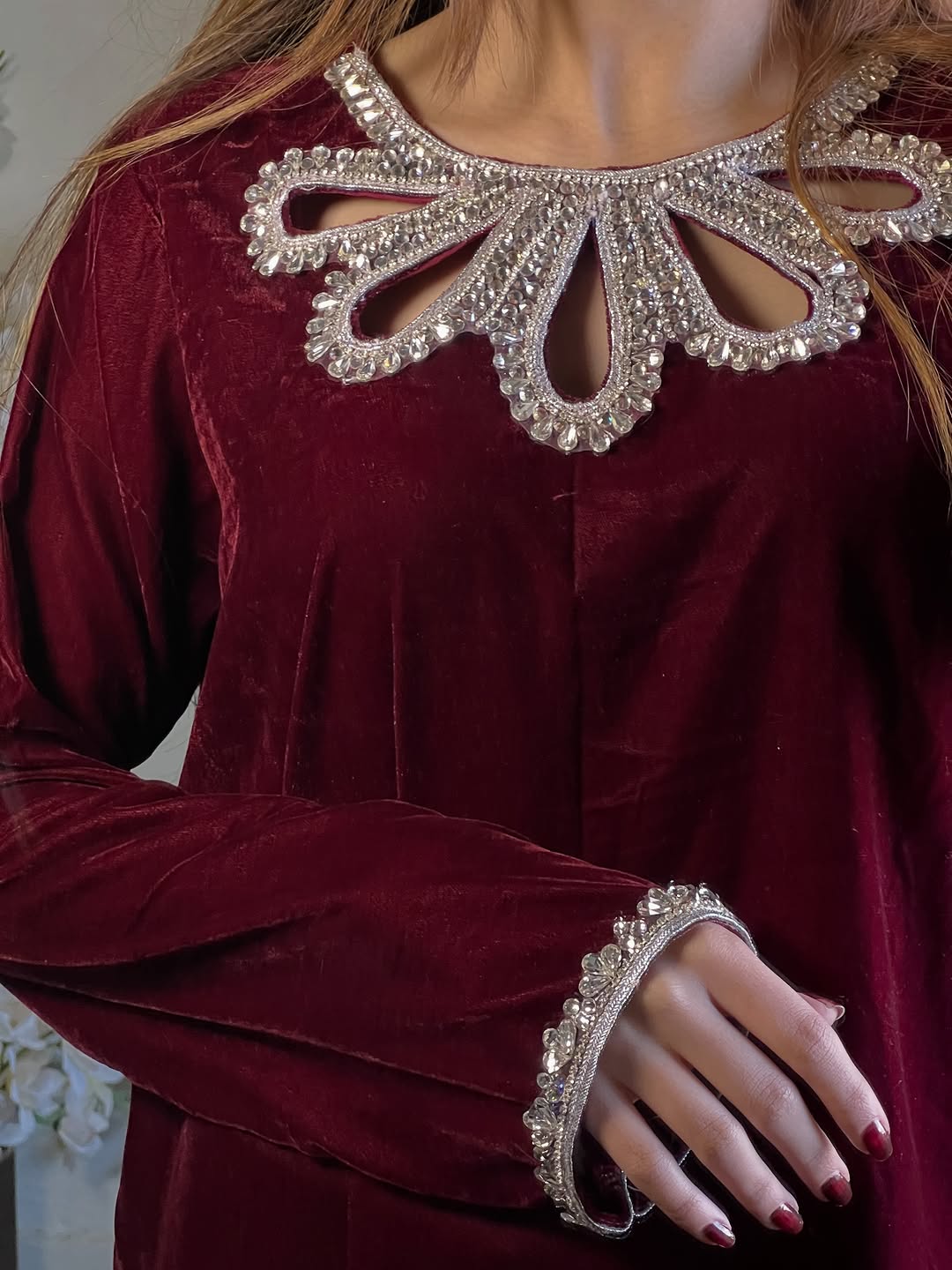 This mahroon dress is Crafted from luxurious Micro Velvet 9000, detailed with crystal-studded neck & sleeves, paired with an organza dupatta finished with 4-side lace. Perfectly made for wedding season, Because winter deserves a touch of royalty. ❄️