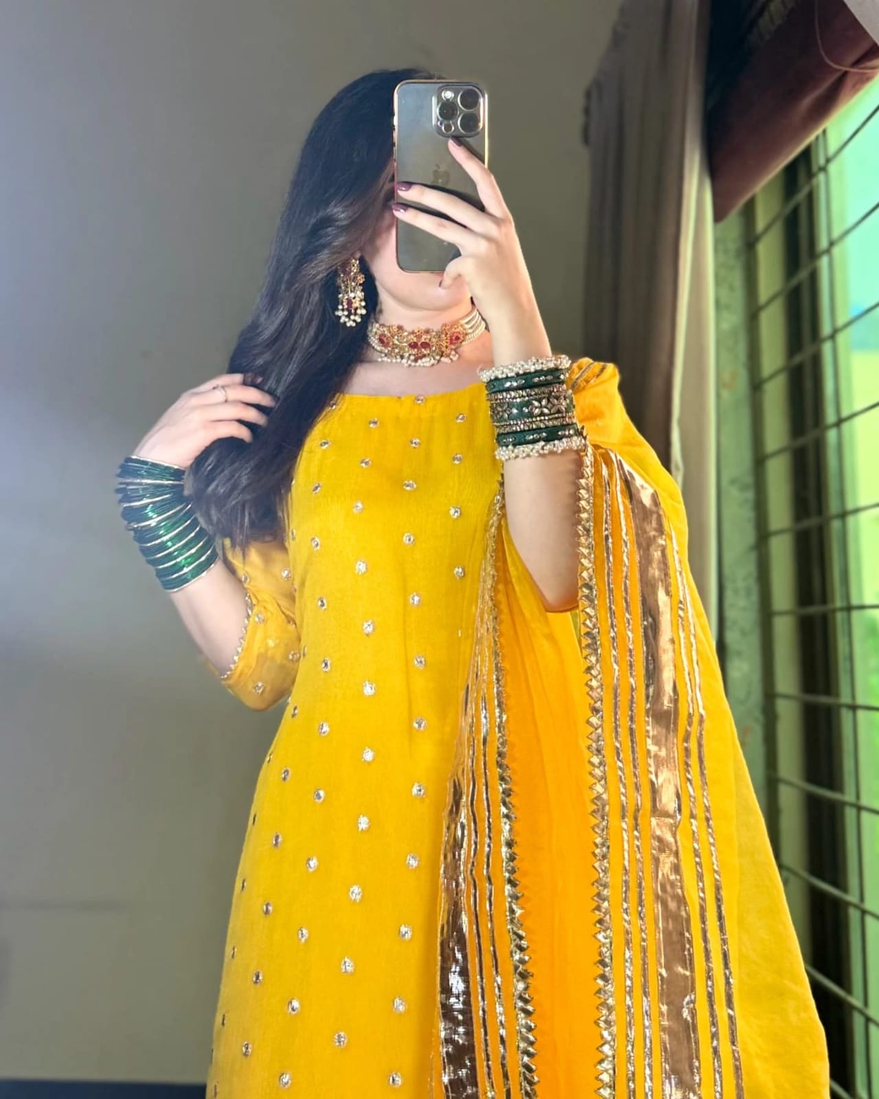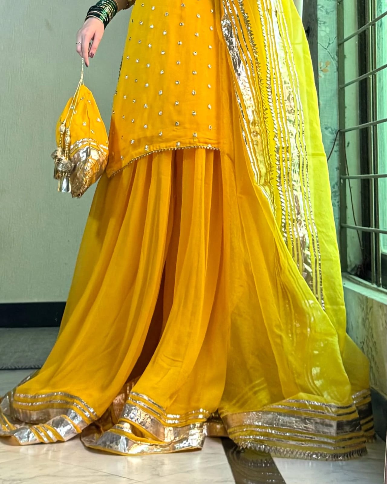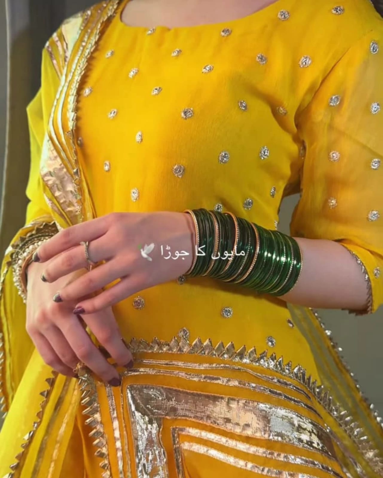 Mayun Wedding dress Yellow Colour 3pc stitched , Fabric pure chiffon, pure chiffon pani work shirt(front&back same work)with backside tassel.(full sleeves available)